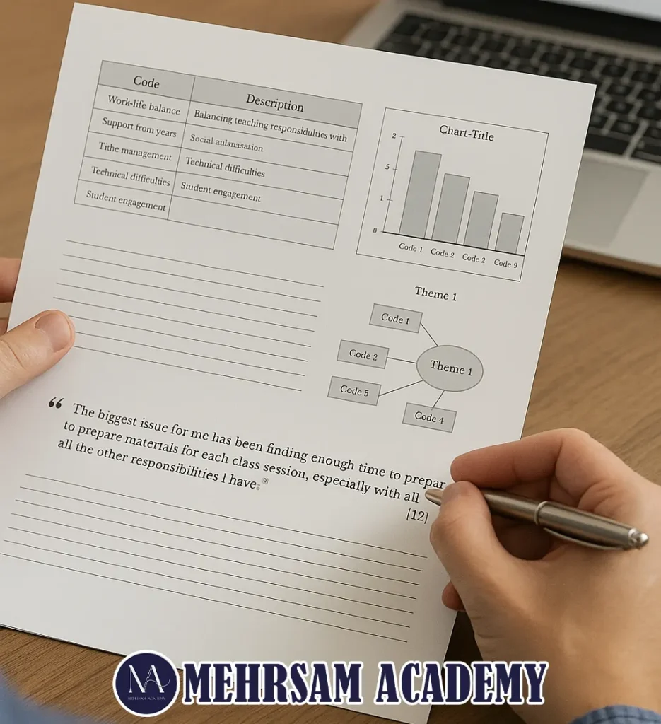 فرض کنید پژوهشگری در حال نگارش مقاله‌ای در حوزه آموزش و پرورش است و به بررسی دیدگاه معلمان نسبت به چالش‌های تدریس آنلاین می‌پردازد. او با استفاده از NVivo، مصاحبه‌ها را وارد نرم‌افزار می‌کند، کدگذاری دقیق انجام می‌دهد، و مضامین مشترک میان پاسخ‌ها را استخراج می‌کند. در مقاله خود، وی می‌تواند جدولی از کدها، نمونه‌های متنی از مصاحبه‌ها و نمودارهای توزیع مضامین را ارائه دهد که نه‌تنها یافته‌ها را مستند می‌کند، بلکه به خواننده نیز کمک می‌کند تا روند استدلال پژوهشگر را دنبال کند.